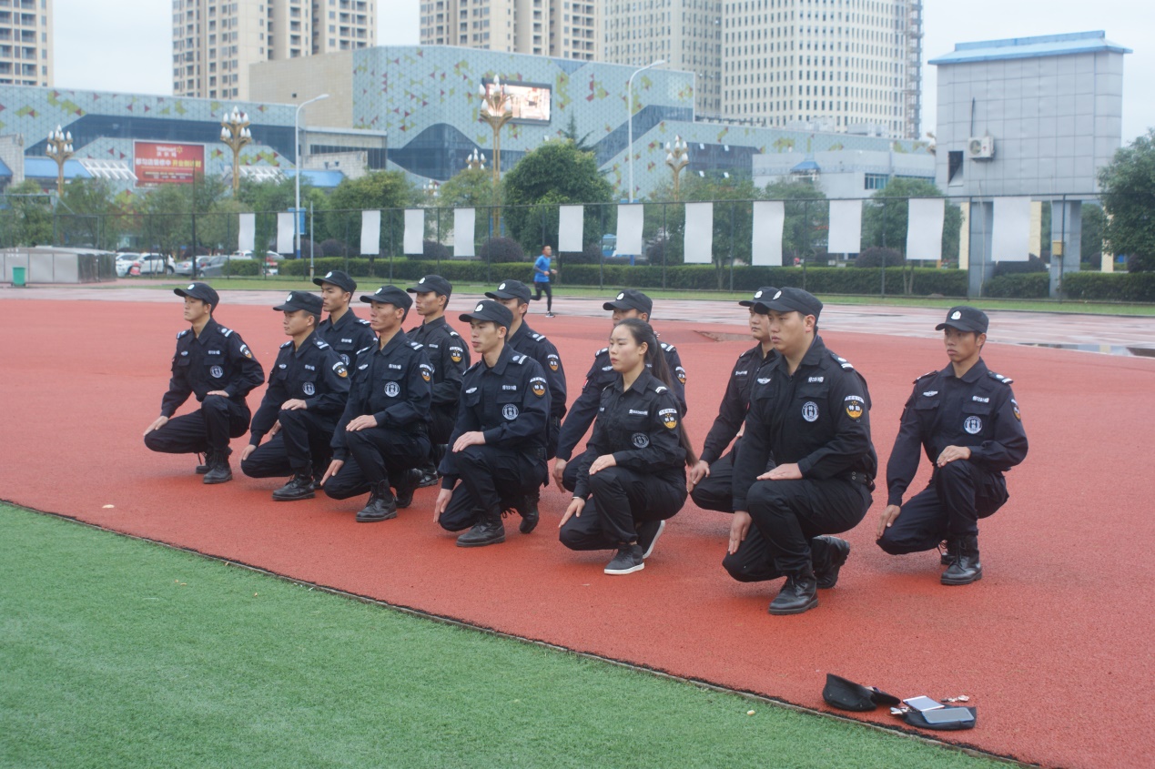 培训在我校田径场进行,主要包括以下几项内容:一、严格要求纪律;二、军姿、队列系统训练;三、体能训练;四、自卫及擒拿技能训练;五、急救、消防、疏散等安全操作训练。